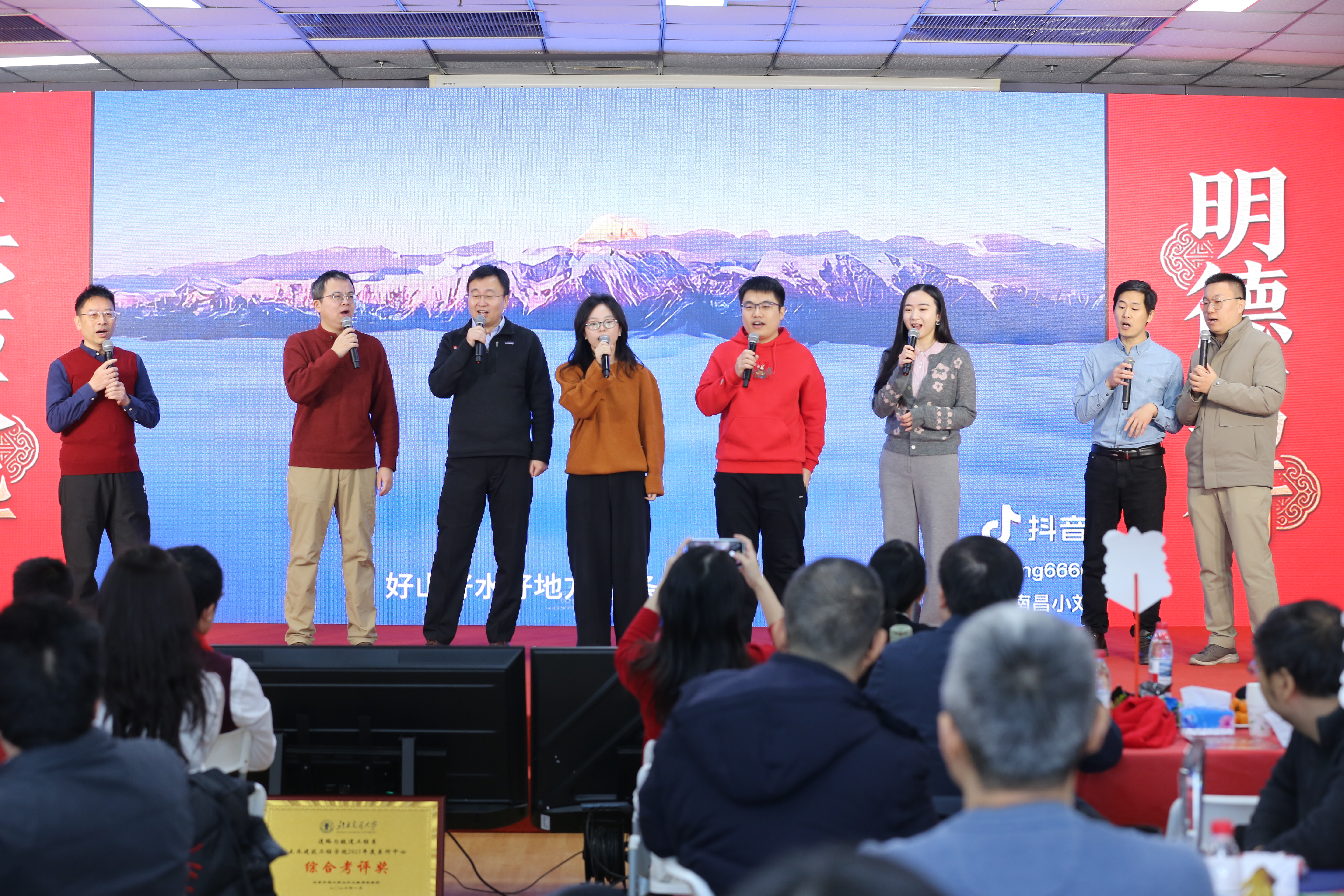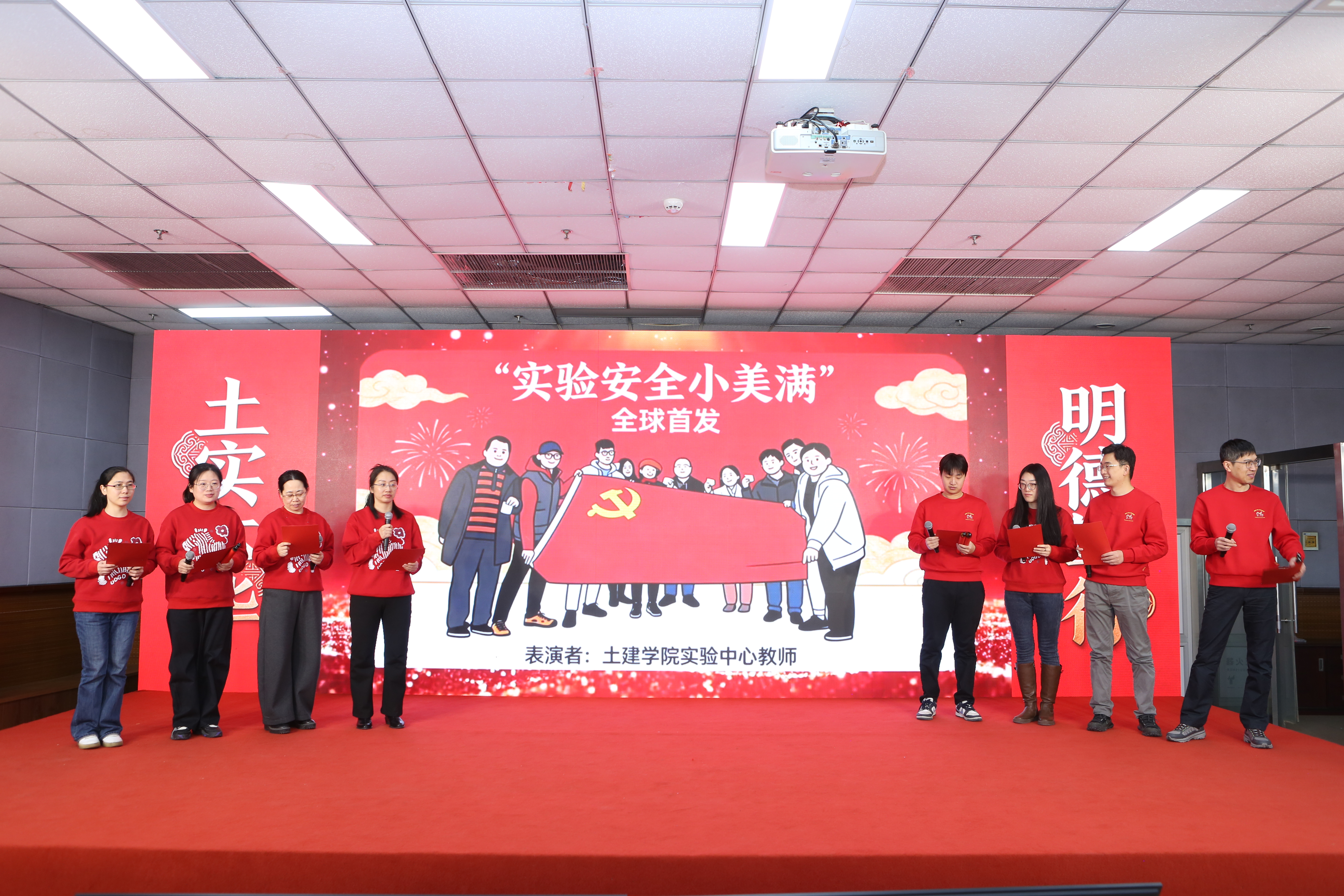 桥梁工程系的诗朗诵《虹桥·岁月·新程》,将专业情怀融入诗意表达,抒发了土建人架设彩虹、贯通岁月的豪情。岩土工程系带来的合唱《这世界那么多人》,歌声温暖动人,感恩相遇与并肩奋斗;地下工程系的趣味配音秀《山河有声,地下无声》,结合专业特色,创意十足,展现了别样的专业魅力。最后实验中心全体教师以一首紧密结合工作实际、歌词寓教于乐的《实验安全小美满》主题合唱压轴登场,在轻松愉快的旋律中强化了安全意识,为整场联欢会画上了圆满而富有深意的句号。